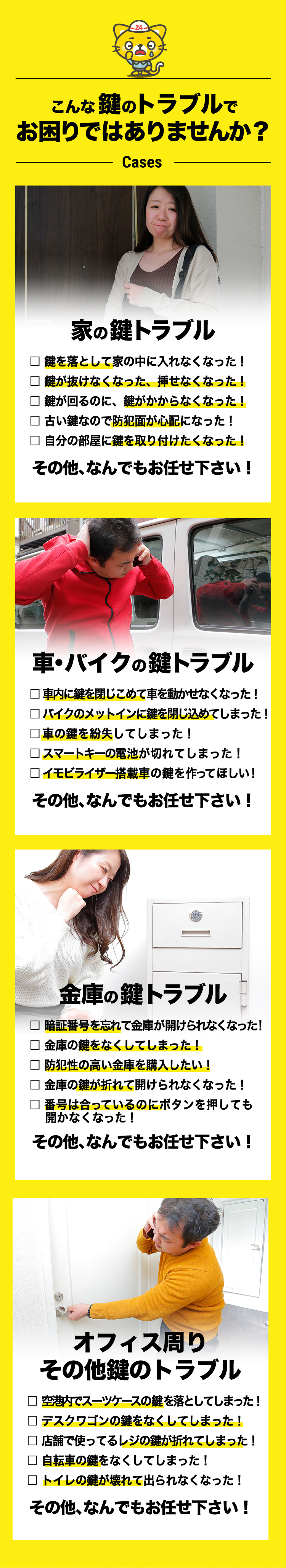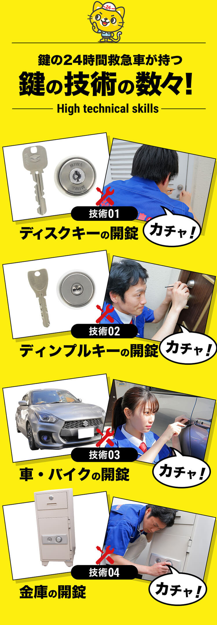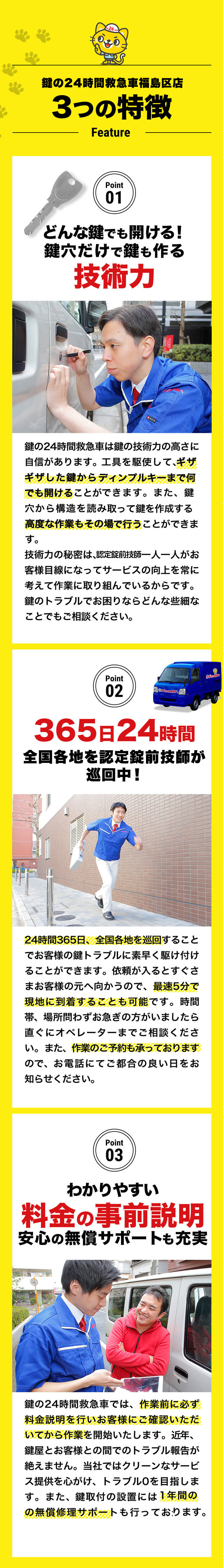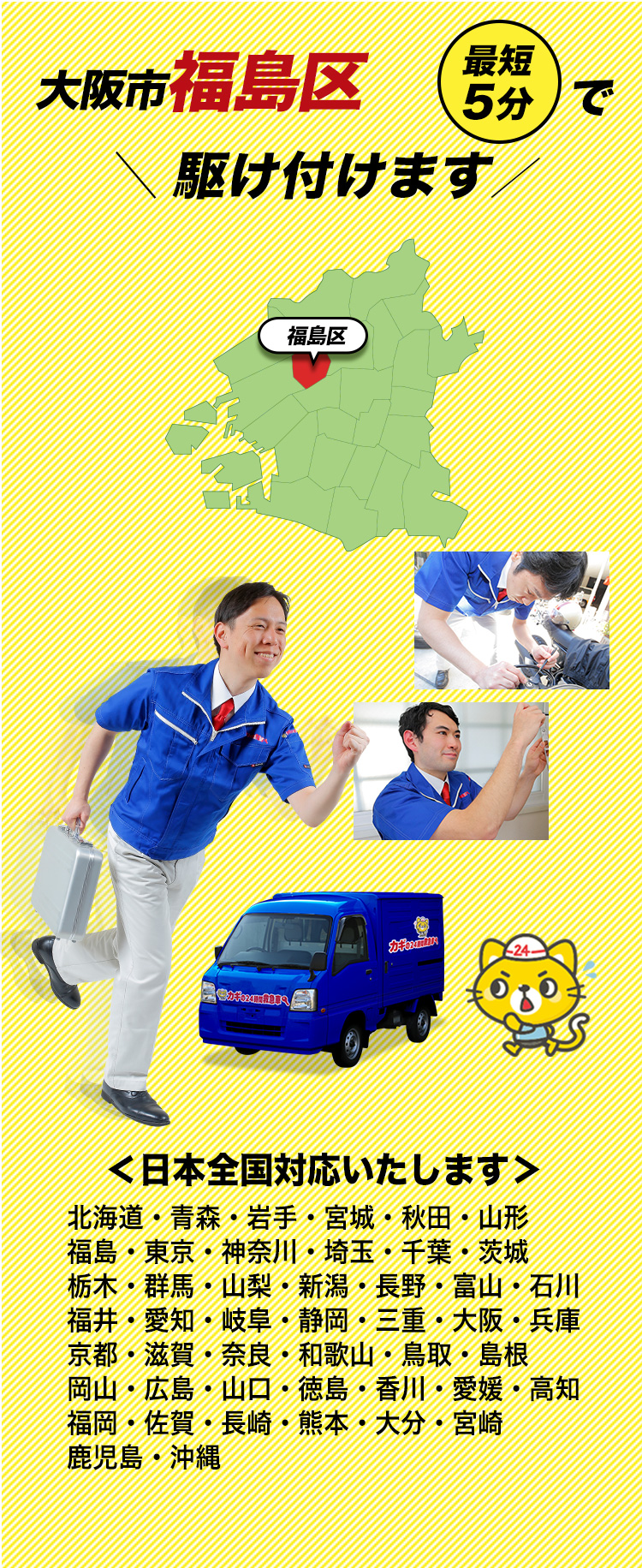 福島区の鍵トラブルは「カギの出張24時間」にお任せください。福島の地域に密着し、常に清潔な服装で訪問。明瞭な料金体系と親切丁寧な接客で、お客様の不安を一掃します。福島区で鍵の迅速対応を求めるなら、当店が最適です。